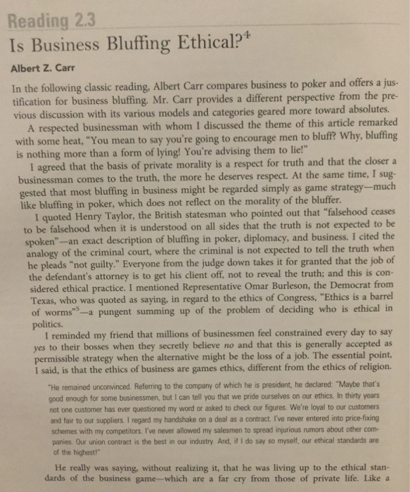 Solved Reading 2 3 Is Business Bluffing Ethical Albert Z